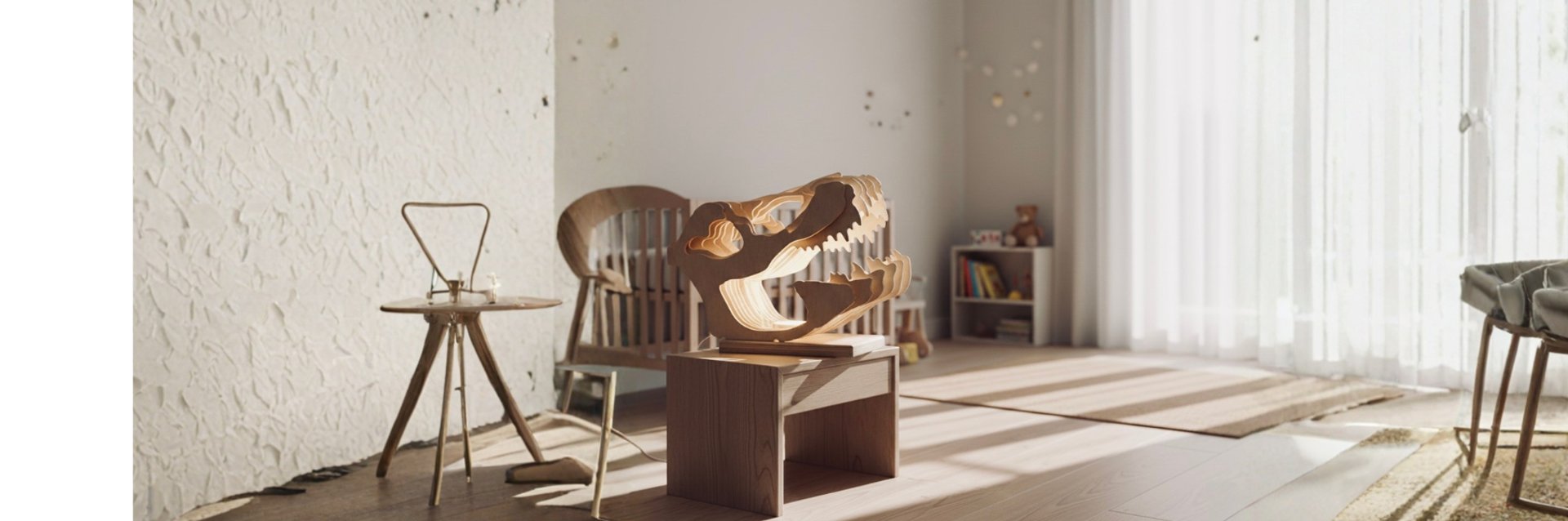 This modern wooden dinosaur skull sculpture LED lamp blends contemporary design with natural Baltic birch to create a bold and artistic home accent. Featuring layered plywood construction, this T-Rex skull sculpture adds depth and architectural interest, making it an eye-catching piece for shelves, desks, and modern interiors. The minimalist design and warm wood tones complement a wide range of décor styles, from modern and industrial to creative and eclectic. Ideal as a statement décor piece or a unique gift, this sculpture brings personality and conversation to any space. Natural wood grain and tone variations ensure every piece is one of a kind.