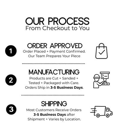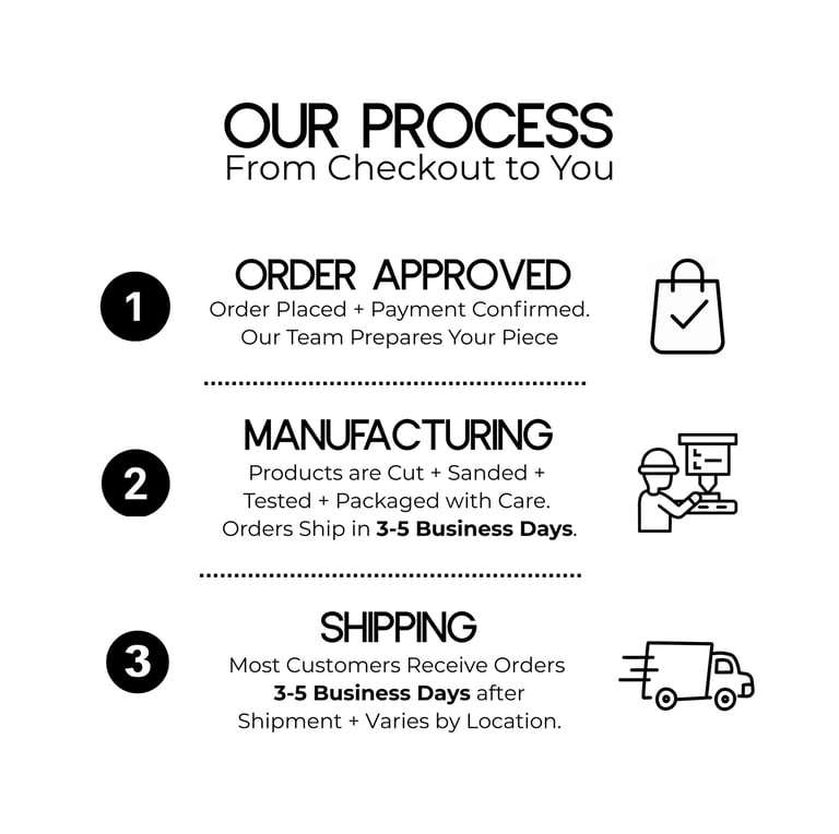 Each piece is crafted with care, cut precisely, hand-sanded to achieve a smooth finish, and tested. Each product takes 3 - 5 business days to manufacture.