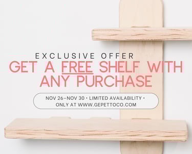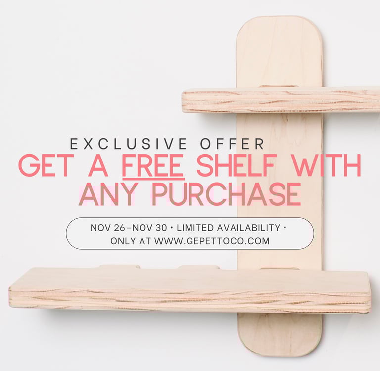 Important Details: - Promotion Period: November 26th - November 30th, 2025 - How It Works: Simply make a purchase of any product, and your free dual shelf will be included in your order! - Limited Availability: Stocks are limited for this promotion, so act fast to ensure you don’t miss out! - Only Available Here: This incredible offer is exclusive to our website, so make sure to shop online at www.gepettoco.com. Don't miss this fantastic opportunity to enhance your home while enjoying our high-quality products. Shop with us during this limited-time event and take advantage of our special offer before we run out of stock! Thank you for choosing Gepetto Co. We appreciate your support and look forward to serving you soon! Happy shopping! Terms and Conditions: - Offer valid from November 26th to November 30th, 2025, or until stock lasts. - DualShelf will be automatically included with your purchase; Checkout does not list the promotion, but the product will be included inside the same box with your purchased item. - Limit one dual shelf per order. For any questions or concerns, reach out at admin@gepettoco.com.